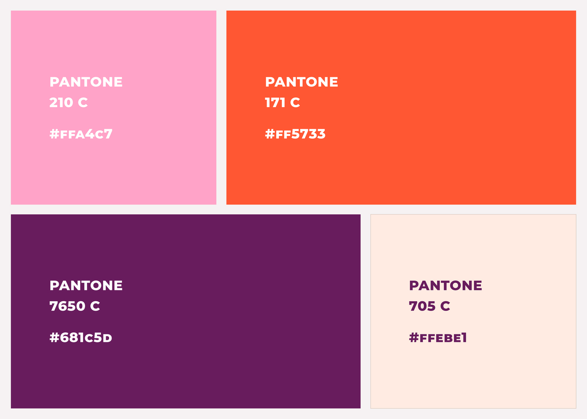 A paleta de cor foi pensada com o objetivo de dar jovialidade, destaque vivacidade e alegria para a marca, e também para não associá-la apenas a um público em específico ou a outras marcas do mesmo segmento. Portanto, o roxo da marca representa criatividade, que é algo que está muito associado a decoração. Já o laranja na marca tem a função de ser estimulante, de trazer um ar de entusiasmo e energia para a identidade. Os tons de rosa, no entanto, tem o papel de ser uma cor auxiliar na identidade.